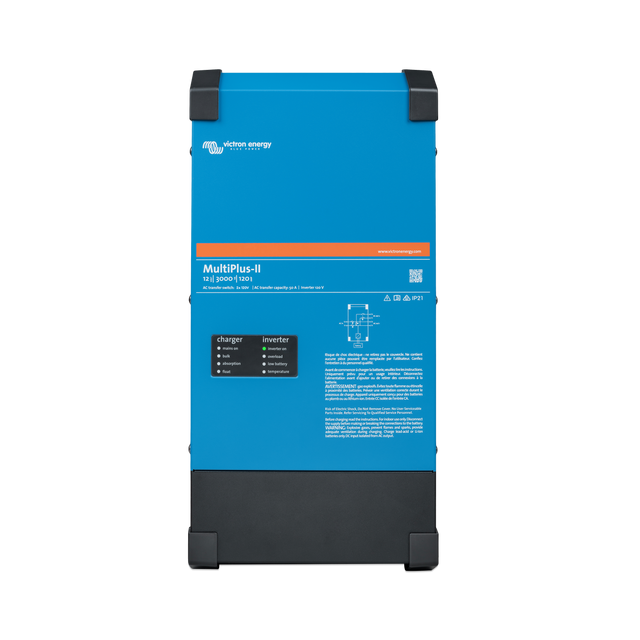 De plus, le Victron Energy MultiPlus-II 2x120V combinera les sorties L1 et L2 pour 120V monophasé sur chaque ligne lorsqu'il est connecté à une alimentation 120V monophasée, acceptant l'alimentation entrante pour la charge et le passage à l'entrée L1.
